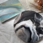液体の絵具をキャンバスに注ぎ傾け、絵具の流れや広がりによって偶然生まれる模様を楽しむポーリングアート!